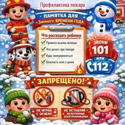 Зимой возрастает пожарная опасность из-за неправильной эксплуатации обогревателей и печей, новогодних гирлянд. При пожаре звонить 1️⃣0️⃣1️⃣ или 1️⃣1️⃣2️⃣назвать свой адрес, телефон, фамилию и что горит!Помните:ВЫ ответственны за безопасность ваших детей!